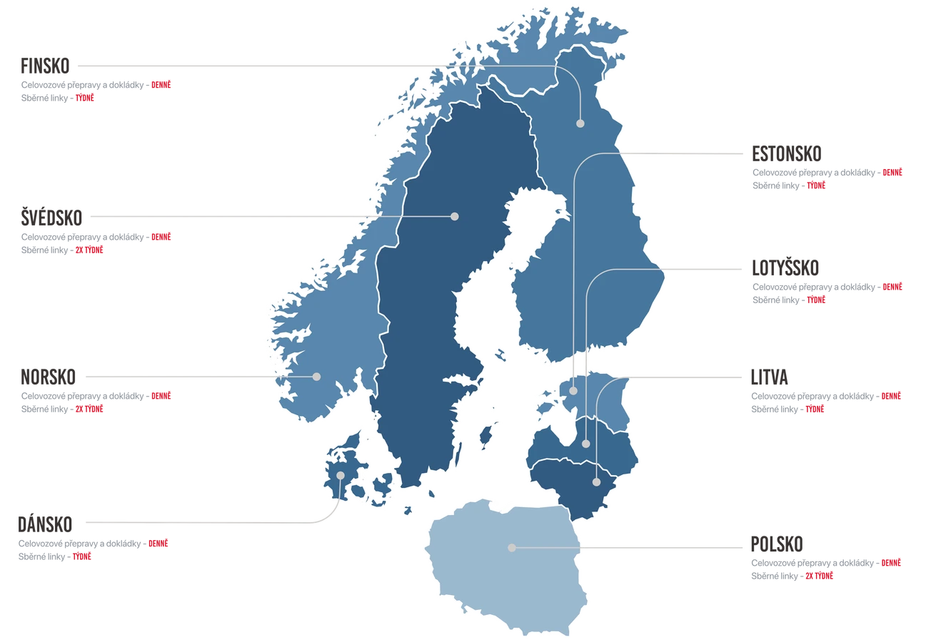 A cost-effective transport solution is provided through our groupage service. Every week, we operate regular routes to Northern and Eastern European countries, with the same frequency for return routes to the Czech Republic. Groupage transport is an ideal option for shipments that do not require express delivery but benefit from competitive pricing.